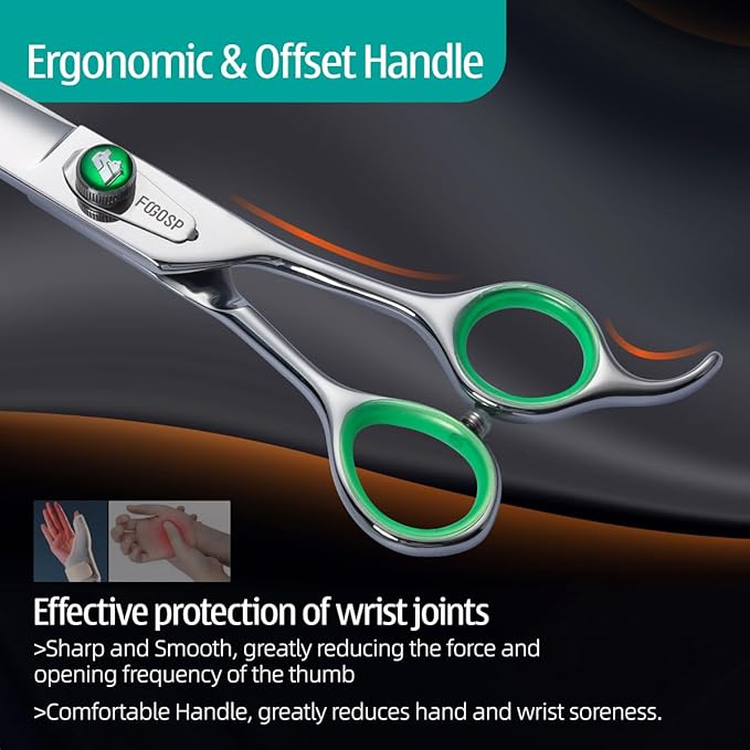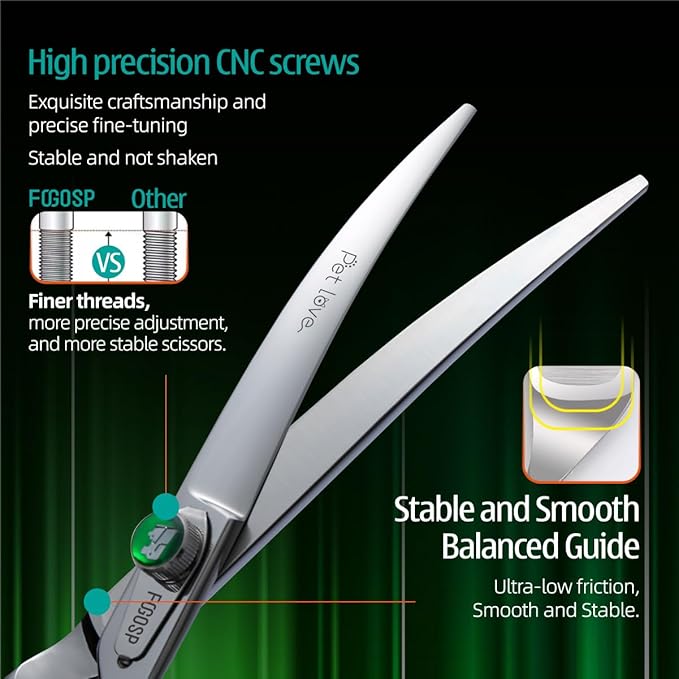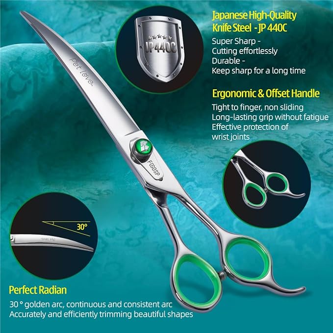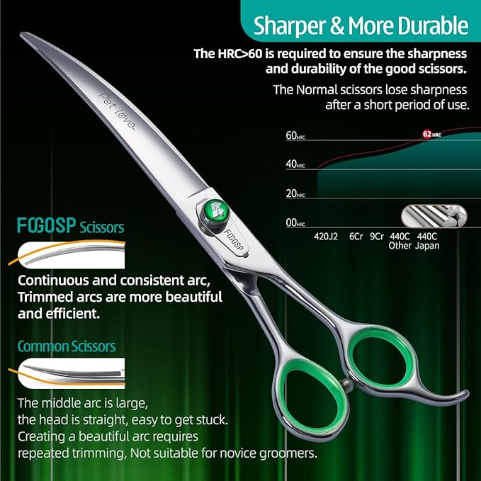 - 💖[Excellent Quality]FOGOSP curved scissors for dog grooming is made of high quality Japanese 440C stainless steel and is very sharp and smooth that using these grooming shears are like cutting butter with hot knife. Custom Leaf-Spring Tension Modifier Knob, making more silky smooth to use. Classic low-press offset handle making them comfortable and lightweight to hold, effectively avoid wrist joint injury.Good Tools Make You Enjoy Your Work Even More.