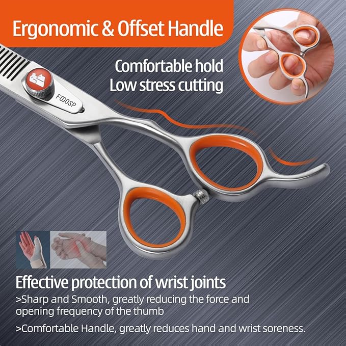 - 💝[Excellent Quality]FOGOSP thinning shears for dogs are made of high-quality Japanese 440C stainless steel and are very sharp and smooth, using these dog grooming scissors is like cutting butter with a hot knife. Custom Leaf-Spring Tension Modifier Knob, make cut silkier and smoother . Classic low-press offset handles make them comfortable and lightweight to hold, effectively avoiding wrist joint injury. Good Tools Make You Enjoy Your Work Even More.