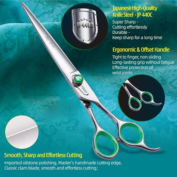 - 💖[Excellent Quality]FOGOSP dog grooming scissors is made of high quality Japanese 440C stainless steel and is very sharp and smooth that using these grooming scissors is like cutting butter with hot knife. Custom Leaf-Spring Tension Modifier Knob, making more silky smooth to use. Classic low-press offset handle making them comfortable and lightweight to hold, effectively avoid wrist joint injury.Good Tools Make You Enjoy Your Work Even More.