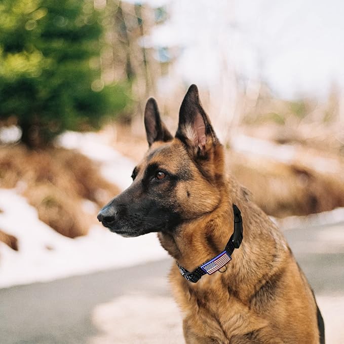 - 4.[REFLECTIVE & AMERICAN FLAG] Including a US American Flag national emblem. Make the collar special, it is a perfect gift for dog lovers. 4 Highly reflective piping making the collar glow in the dark. So you will be seen from distance and walking in the dark would be safer. Personalize your pup with 5 colors, red, purple, black, blue, pink.