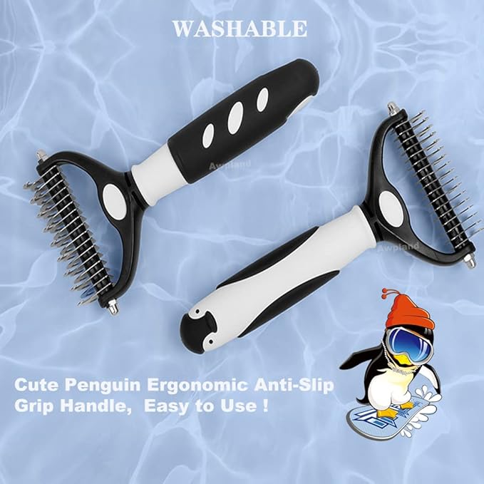 - 🐧Penguin dog deshedding tool: Penguin handle design, You will find the dematting brush for cats is fun and useful to grooming your dog or cat and let your pet will love being brushed!