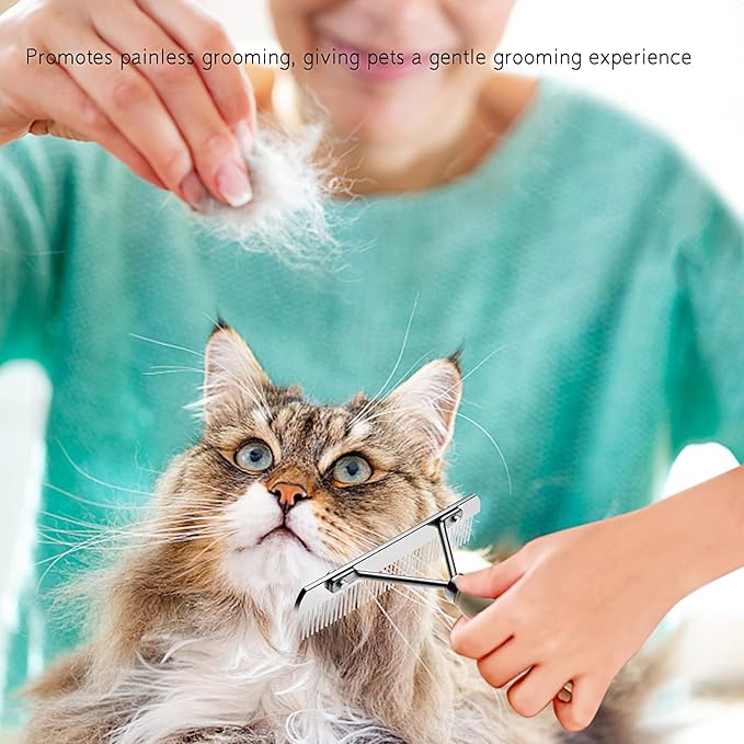 - 【Deep Massage】- The long teeth of the undercoat rake and knots comb are made of stainless steel which is waterproof and oil-proof. No generate static electricity to avoid secondary tangling of pet hair. The tips of the long teeth are polished and smooth without burrsmaking them more acceptable to pets with sensitive skin. The rounded comb teeth massage the pet skin while combing to promote blood circulation.