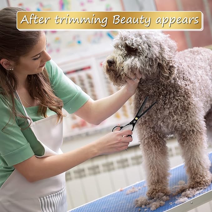 - ★Professional Pet Grooming Scissors Kit★-The kit includes 1 × 6.5-inch thinning shear, 1 × 6.5-inch curved scissor, 1 × 6.5-inch straight scissor, 1 × pet comb, 1 × cleaning cloth, 1 × black leather case
