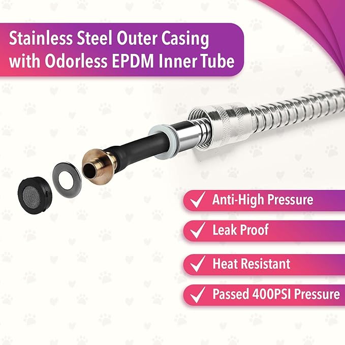 - 👌 ERGONOMIC & EASY TO USE: Simply attach one end of the hose to the faucet and the other end to the handheld shower head for dogs and you and your dog should be ready for a fun bath time at bathtub. The hexagonal shape makes the pet shower head comfortable to hold making it easier to brush and scrub your lovely dogs.