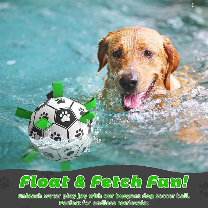 - 🐶Upgrade Interactive Dog Toy: Dog soccer ball with nylon tabs sewn evenly into the seams not only create an erratic bounce that dogs love to chase, but also make it easier for the dogs to fetch, toss, tug and retrieve. Dog paws are printed evenly on the dog toys ball to attract dog's attention. There's a longer strap for people to hold onto the ball, making it a great interactive dog toy to train your dogs.