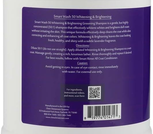 - GROOM LIKE A PROFESSIONAL - Chris Christensen SmartWash50 Whitening & Brightening Shampoo is a gentle, but highly concentrated shampoo that effectively whitens whites and brightens dull coats without irritating the skin.