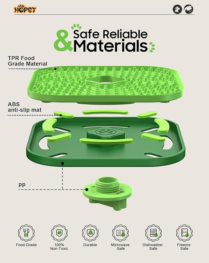 - 【𝗦𝗧𝗨𝗥𝗗𝗬, 𝗙𝗥𝗘𝗘𝗭𝗘𝗥 & 𝗗𝗜𝗦𝗛𝗪𝗔𝗦𝗛𝗘𝗥 𝗦𝗔𝗙𝗘】 Crafted from TPR food-grade silicone, our dog lick pad ensures durability & safety for your furry friend. It's freezer-safe, allowing you to add treats like yogurt to prolong licking time & cool your pet during hot summer days. The mat is easy to clean and dishwasher safe, making maintenance a breeze