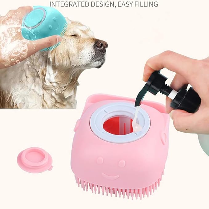 - EASY TO USE: At the top of the bottom, you can open the small ring and pour shampoo and water. When in use, you can press the top silicone button to produce foam. will gently remove loose hair, dust, and dirt. Dog Hair Brush with numerous soft nubs will ensure a no-scratching massage without scratching pet skin and dead fur while bathing.