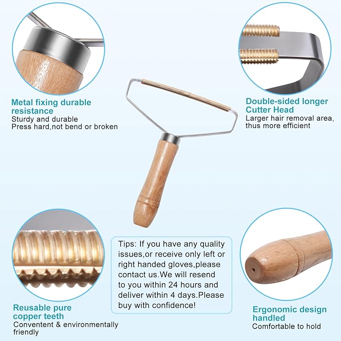 - [Upgraded Combination & Widely Use]:Copper pet hair remover be used for thick piled item and sheavy duty, such as winter coats,carpet,furniture, ar car interiors, and etc.Plastic fabric shaver can be used for soft and thin fabrics,such as pet,bed sheet,sweatshirt,velvet,and etc.Gloves can provide a soft and relaxing massage.