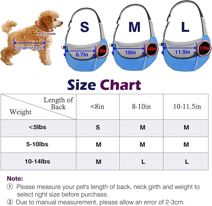 - Multi-size and Wide Application: Our dog crossbody satchels are available in three sizes and in a variety of colors. Please measure your pet's length of back, neck girth and weight according to the size chart in the third picture to choose the right size before purchase. The hand-free design make it perfect for everyday use such as shopping, biking, traveling and mountain climbing. Let your dog be by your side at all times!