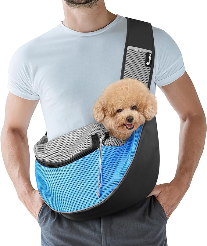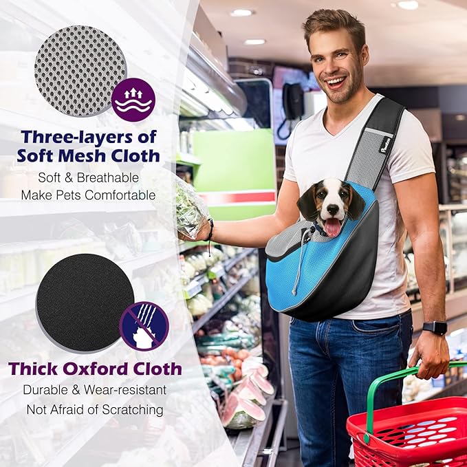 - Safety: Made of oxford cloth and air mesh, this pet sling carrier is stretchy and provides cushioning protection for your pet. The drawstring prevents the dog from accidentally opening the zipper, while also preventing him from chewing the sling bag. Built-in safety collar hook, you can buckle it to the dog's collar or harness to prevent it from falling off.