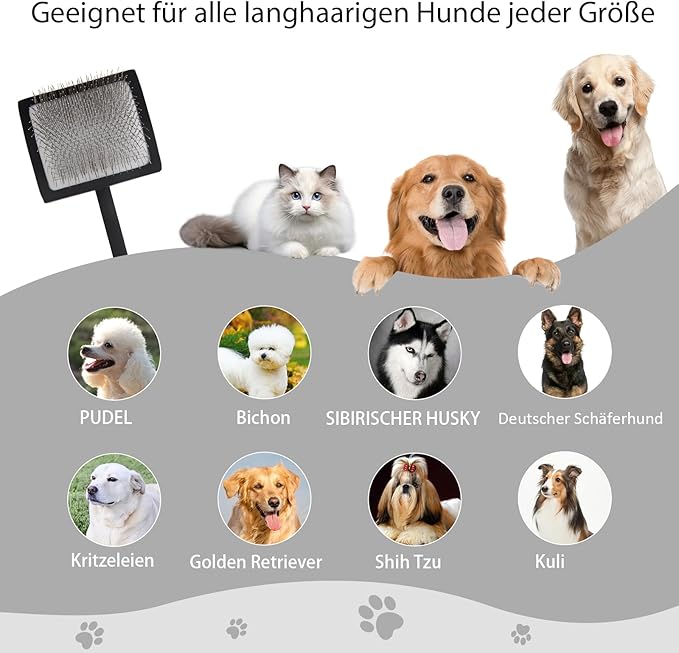 - [Support Most Hair Types] Best for Grooming Medium or Long Haired Dogs. It is the best dog slicker brush for Poodles, Goldendoodles, and Labradoodles because of its ability to remove tangles and mats with ease. Available in two sizes to fit your breed and size of dogs & cats.