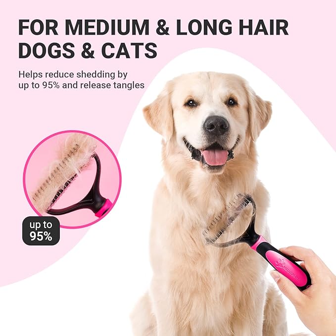 - All in 1 Cat Dog Undercoat Rake: Dematting, deshedding and brushing at the same time. Easy and pleasant use dog rake for you & great experience for your dog. Durable and comfortable handles in solid construction, easy to hold and fit well in hand