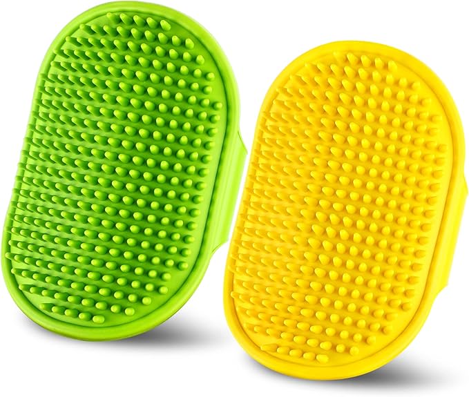 Dog Bath and Grooming Brush | Shampoo Massage Comb With Adjustable Loop Handle for Short and Long Hair Cats and Dogs, 2pcs (Tapered Head, Yellow + Green)