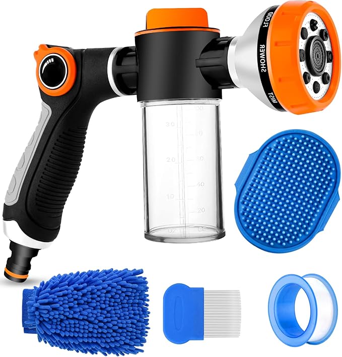 - 8 Spray Patterns: The dog wash foam sprayer has 8 types of nozzles, rotate click spray selector for different settings ( rinse, stream, flat, center, jet, shower, mist, and cone ), whether you need wash your car, or the gentle shower to wash your pet, the 8 patterns have you all covered. which can bathe your pets, water lawns, plants, gardens, wash your car, spray nozzle for garden hose fit your different needs.