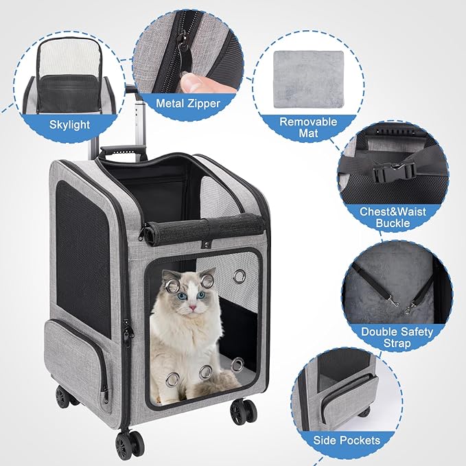 - SUPER LARGE SPACE: The cat backpack with wheels measures 15.8"L * 13.8"W * 21.5"H, the interior space is twice the normal size on the market, designed for large cats under 30 Lbs and small to medium dogs under 25 Lbs, allows your pet to move around more comfortably and reduces the anxiety