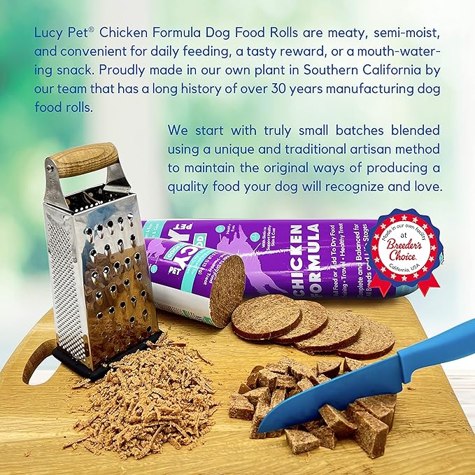- Meaty, semi-moist premium dog food roll loaded with chicken that can be used as a full feed, as a treat, or a topper mixed over Lucy Pet dry food. Enticing for the pickiest of eaters with its palatable, meaty texture, and tantalizing aroma. Now in convenient 6 pack!