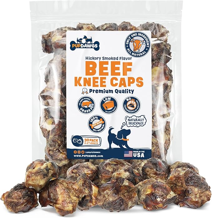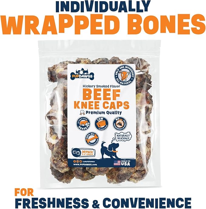 Single Ingredient Dog Bone Made in USA - Beef Knee Caps - 100% Natural Dog Bones for Aggressive Chewers - from USDA Inspected Beef - Hickory Smoked - Individually Wrapped (30 Piece Pack)