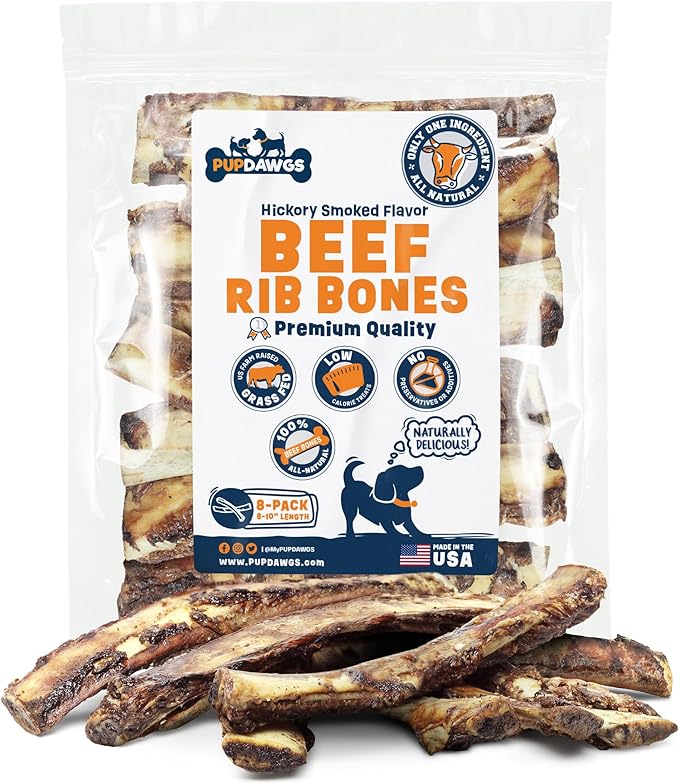 Single Ingredient Dog Bones - Made in USA – 8-10” Beef Rib Bones - Natural Dog Bones for Aggressive Chewers - from USDA Inspected Beef - Hickory Smoked - Individually Wrapped (8 Piece Pack)
