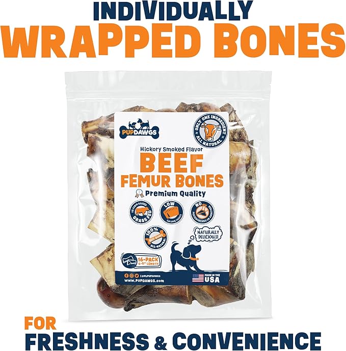 Single Ingredient Dog Bones - Made in USA - Beef Femur Bones - Natural Dog Bones for Aggressive Chewers - from USDA Inspected Beef - Hickory Smoked - Individually Wrapped (16 Piece Pack)