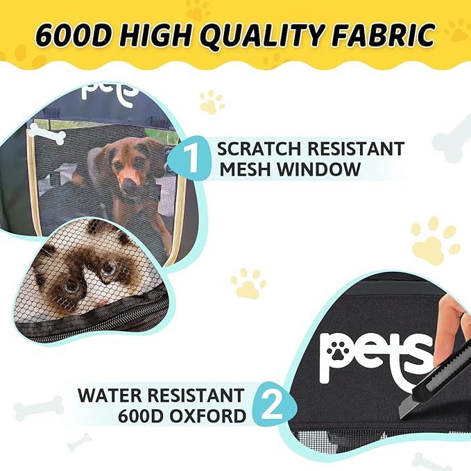 - 【Humanized Design】3 Especially Design--A: offer enough air and Sun for your sweety pets--side and top breathable & transparent mesh window. B: easy for your pets to enter and exit--front and rear door design. C: convenient interaction with pets and share happy time-Top window can be opened and closed with a zipper,which also avoiding the escape of your little pets.