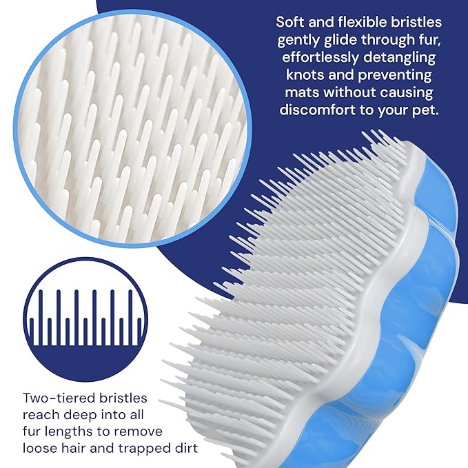 - Its unique bristle design and pattern calms pets while it gently unravels knots in hair and fur.