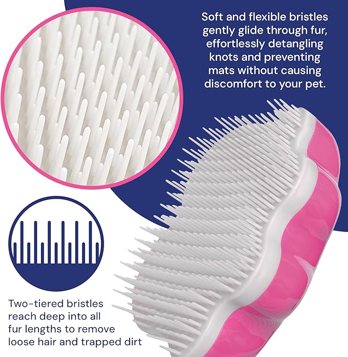 - Its unique bristle design and pattern calms pets while it gently unravels knots in hair and fur.