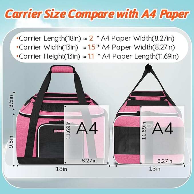 - 【AIRLINE APPROVED CARRIER 】Unfolded size:18"L×13"W×(9.5+3.5)"H, Petskd pet carrier is TSA approved and can be placed under the seat in the cabin, it is mainly designed for ①Southwest Airlines:18.5x13.5x9.5"②Allegiant Airlines:19x16x9", but also in compliance with ③Air Canada:21.5x15.5x10.5". We recommend you buy this carrier when you fly with the above-mentioned airlines.