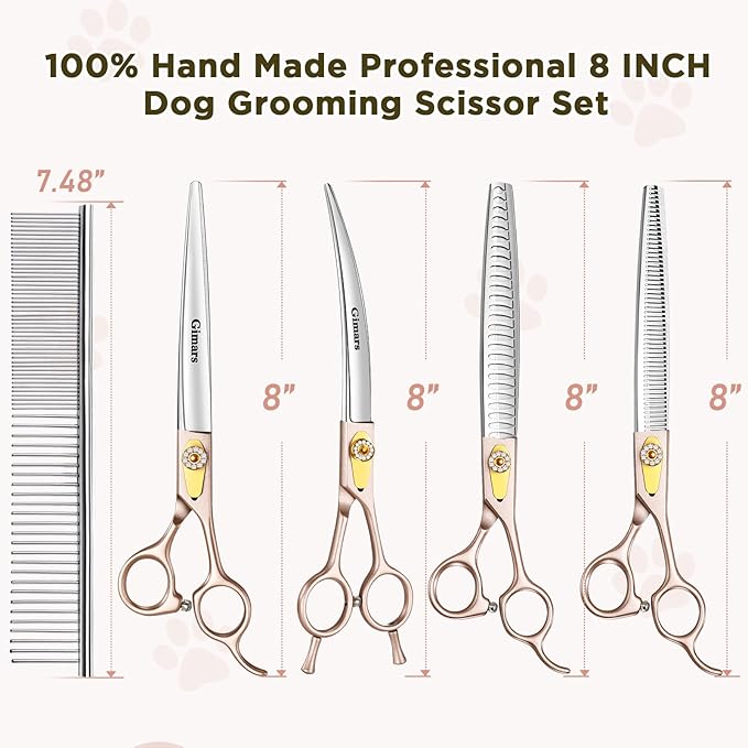 - Complete dog grooming scissors set: This set includes everything you need for a comprehensive grooming session: 8-inch straight scissors, 8-inch thinning scissors, 8-inch curved scissors, 8-inch chunker, a storage case, a cleaning cloth, and a stainless steel comb (comb color may vary). Perfect for all your grooming needs!