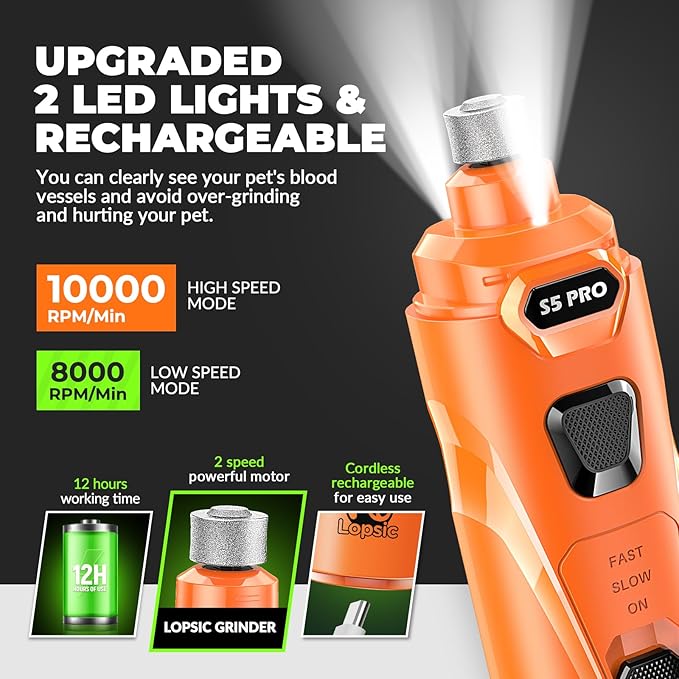 - 【Improved Precision: 2 LED Lights & Adjustable Speeds】: LOPSIC dog nail grinder for dogs features 2 LED lights that offer clear visibility of the quick, ensuring precise and safe nail trimming for your pets. The adjustable speeds(8,000 RPM to 10,000 RPM) of dog nail trimmers can adapt to small, medium and large pets nail trimming needs. When using the dog nail trimmers at the proper speed, pet nails of different hardness can be efficiently ground.