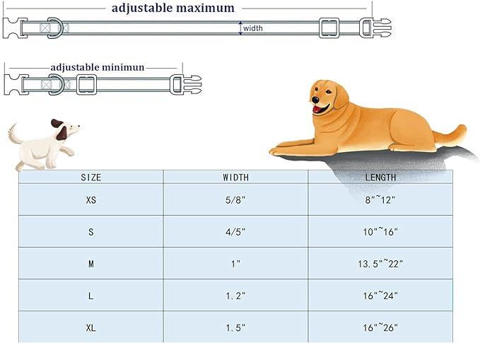 • SIZE: XS Collar (Width : 5/8"Length : 8-12"). S Collar (Width : 4/5" Length : 10-16"). M Collar (Width : 1" Length : 12-22"). L Collar (Width : 1.2" Length : 16-24"). XL Collar (Width : 1.5" Length : 16-26").
