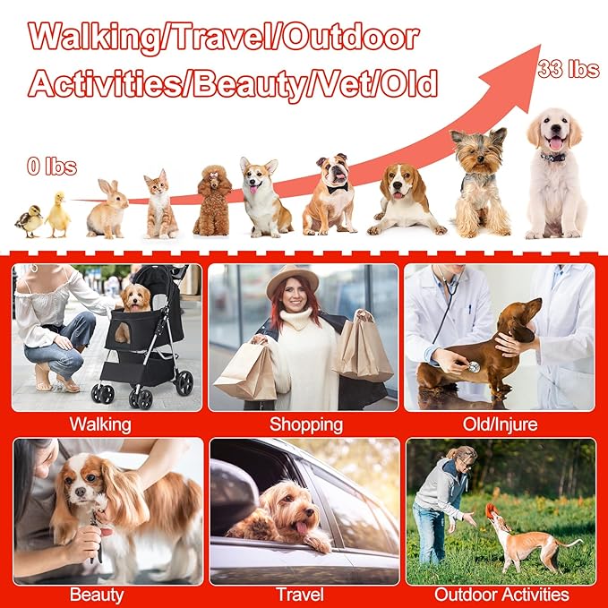 - 🐶【Durable Pet Stroller Built to Last】- This pet stroller is made of high-quality steel frame and oxford cloth fabric that can withstand daily use and harsh weather conditions. The oxford cloth fabric is easy to clean and maintain, while the steel frame provides a solid and durable structure, supporting up to 33lbs small dogs and cats.