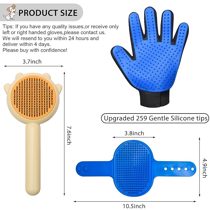 - Perfect Grooming Combination:1 pcs Dogs Cats Brush,1 pcs Dogs Cats Grooming Glove,1 pcs Dogs Cats Bath Brush;The grooming kit can be used short, medium and long, thick, thin and curly haired pets,let your pet’s coat soft and shiny