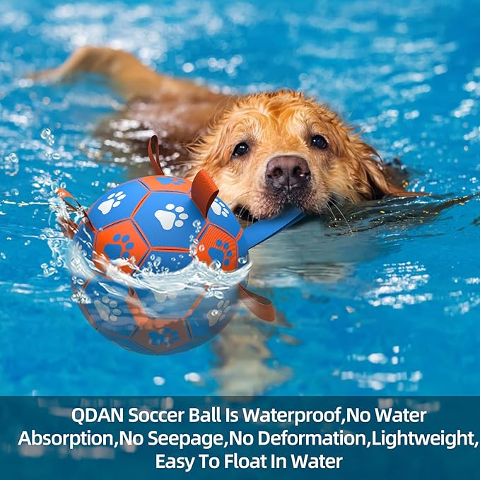 - ⚽ ⚽ QDAN Dog Soccer Ball Best Gift For Your Dog - Send your dog a birthday gift.House and Outdoor Dog Toys can be played in the living room,pool,lake and beach,because it is also Water Toys Ball,no water absorption,no seepage,no deformation,lightweight,easy to float in water.Dog Soccer Ball with Grab straps are great for dog catching balls and increasing your dog's interest in playing.