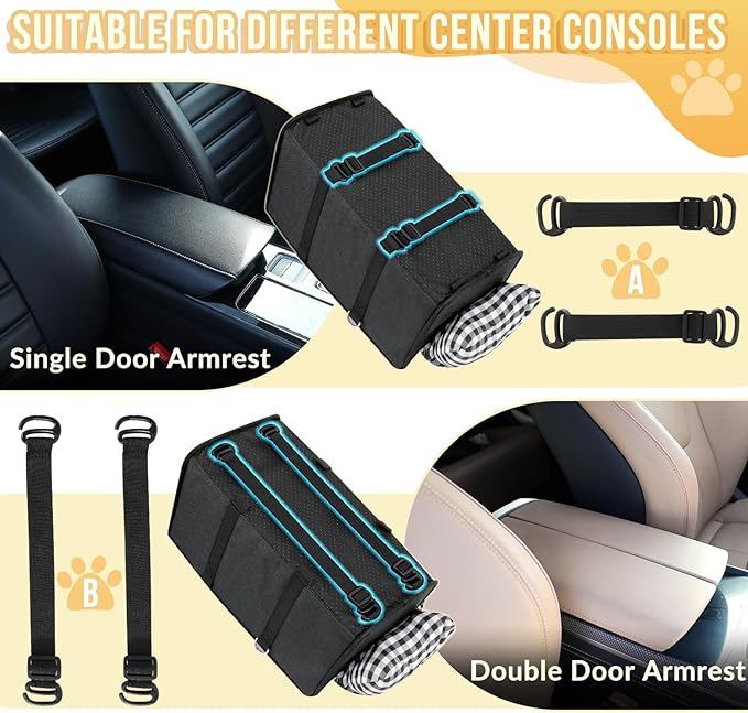 - 𝐒𝐥𝐢𝐝𝐢𝐧𝐠 𝐏𝐫𝐞𝐯𝐞𝐧𝐭𝐢𝐨𝐧 --- This new version center console bag has two straps on left and right sides that can be attached to the driver's and passenger's seat headrests. The puppy console car seat prevents the bag from sliding during car rides and ensures your dog's safety. The end of straps have metal hooks for quick detachment and can also be used as shoulder straps when the bag is not in use