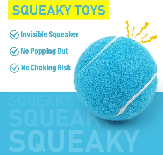 - SAFE MATERIAL & DESIGN: Our Squeaky Pet Tennis Balls are made from premium natural rubber with durable well-bonded non-abrasive felt, Lead-Free & BPA-Free, safe for your pets. The tennis balls equips with fully covered invisible squeakers, will not pop out, which avoid choking hazard for your pets