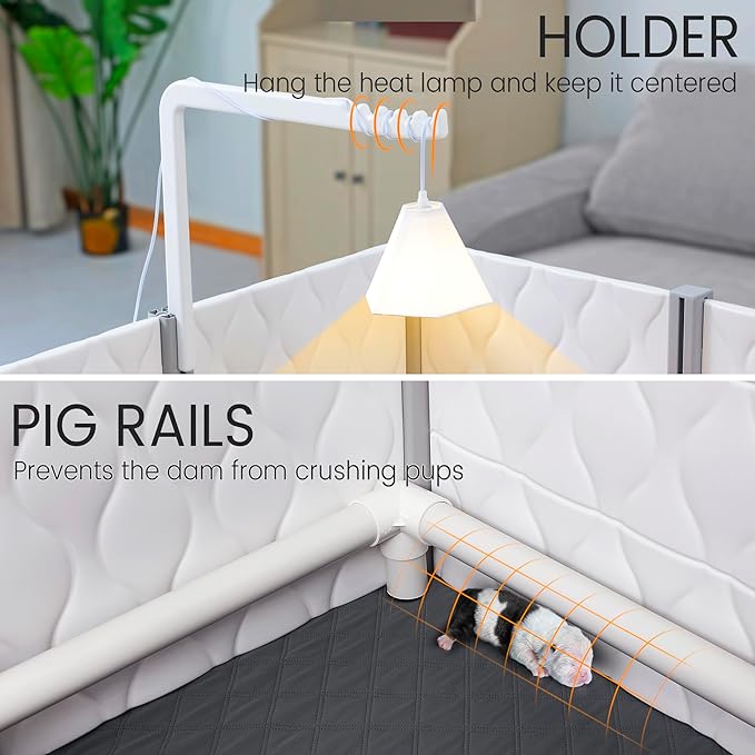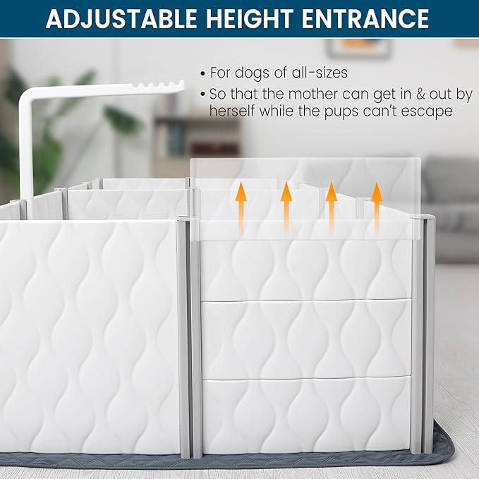 - Optimal Safety for Your Pups: Premium PP and HDPE materials used in injection molding - sturdy and tightly connected without gaps; each wall weighs 4 lbs, providing enough weight to make it effectively self-supporting and prevent movement even when a dog leans against it; the pig rail prevents the dam from crushing pups that may get stuck between her body and the edges of the box. All are designed for absolute safety, so you can really relax without worrying about your new-born pups.