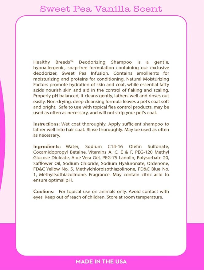 - Hypoallergenic formula is safe for use with topical flea control treatments. Healthy Breeds Deodorizing Shampoo is gentle and soap-free leaving your dog’s coat silky and lustrous!