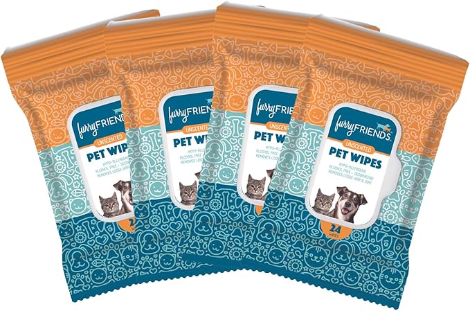 FurryFriends Pet Wipes | Unscented | Hypo-allergenic | Alcohol Free| Deodorizing | Removes Loose Hair & Dirt | Incredibly Clean | 4 Pack