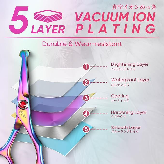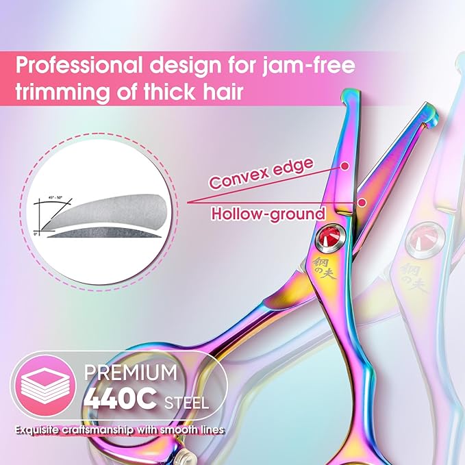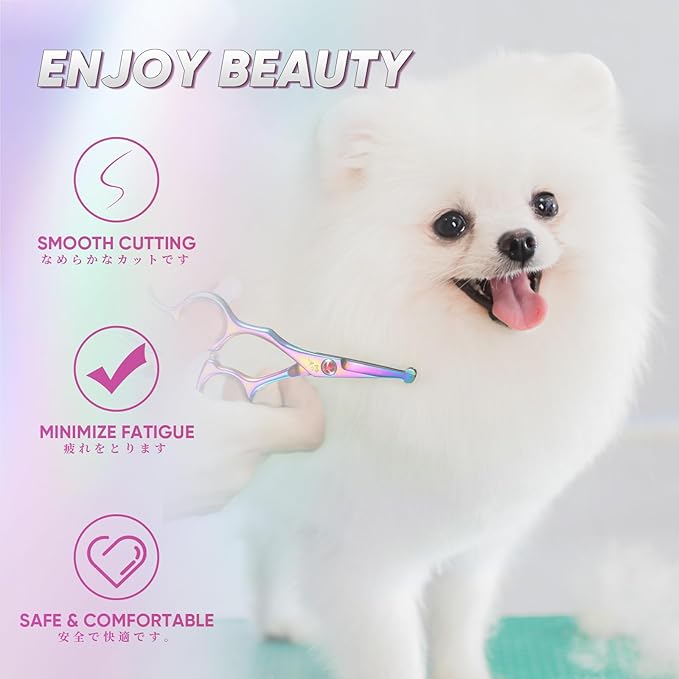 - Premium Material: Our grooming scissors are made of premium 440C stainless steel, known for its exceptional strength and durability. This material has excellent edge retention properties, ensuring the blades remain sharp for precise and effortless grooming. Its rust-resistant properties make our scissors resistant to corrosion, guaranteeing long-lasting performance even with frequent use. Choose the ultimate in performance and long-lasting durability with our grooming scissors!