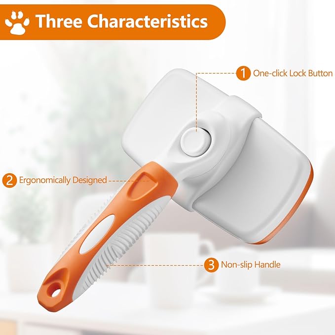 - 🐇One-touch Lock Button: Our pet brush features a convenient one-touch lock button that securely holds the bristles in place. This allows for easy cleaning and storage, ensuring the longevity of the brush and maintaining its effectiveness in removing shedding hair.