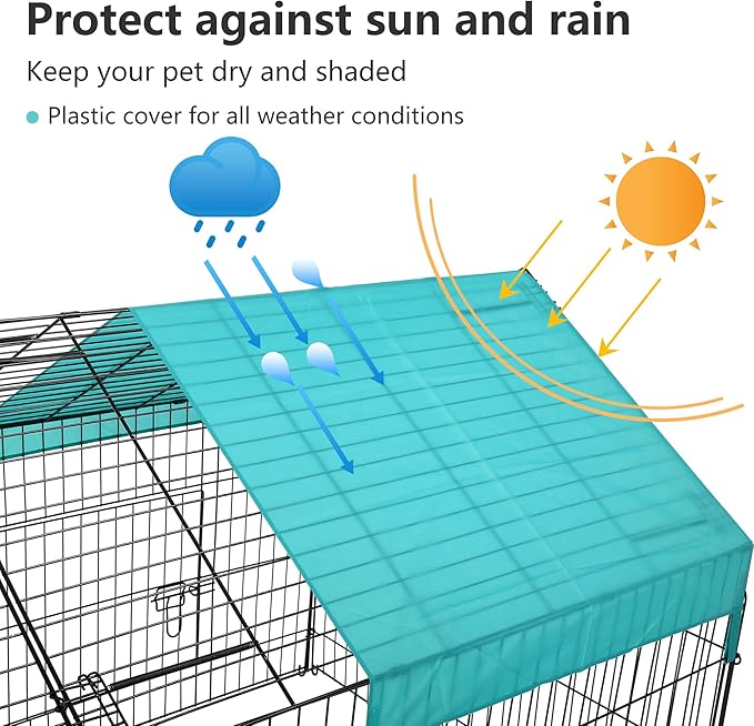 - ✔【Extra Protection of UV Proof Cover】Our chicken coop comes with a green polyester UV and waterproof cover which can provide extra protection for your pets on rainy, snowy or scorching days; It is also convenient for you to install with 8 clips; The half hollow-carved design allows the debris to slide down easily without accumulating on the surface.