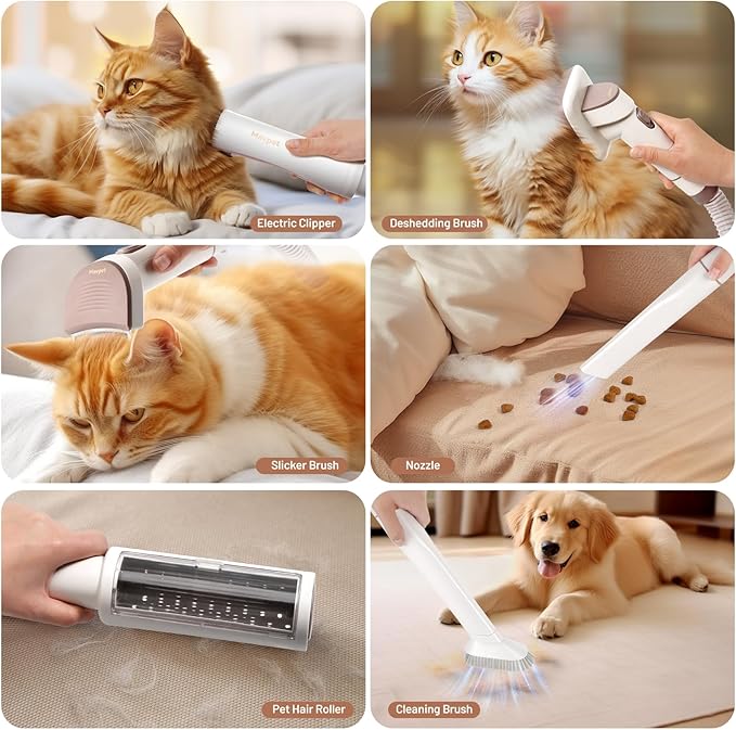 - Comprehensive 6-in-1 Grooming Kit: pet's grooming vacuum includes six grooming tools that not only enhance your pet's appearance but also serve as handy solutions for everyday tasks like removing pet hair from sofas and clothing