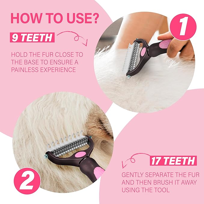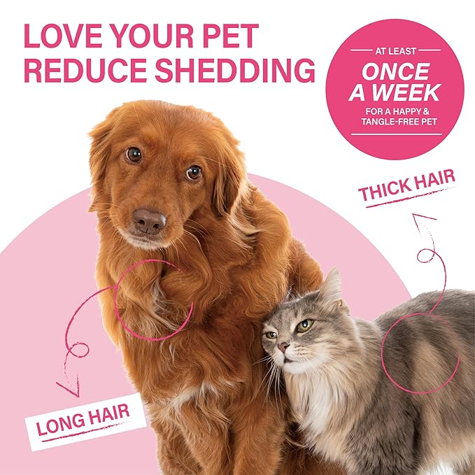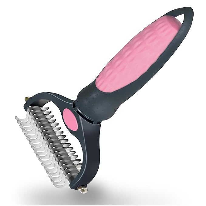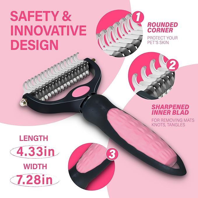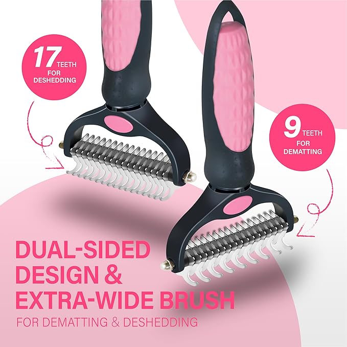 Pet Grooming Brush - Professional Undercoat Rake for Long-Haired Dogs & Cats, Extra Wide Double-Sided Stainless Steel Teeth for Removing Knots, Mats, and Tangles, Reduce Shedding by 95%, Pink