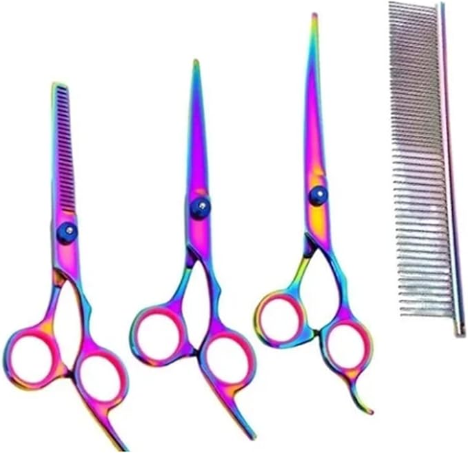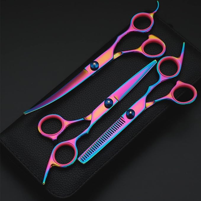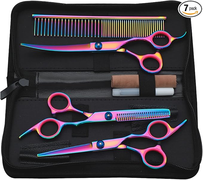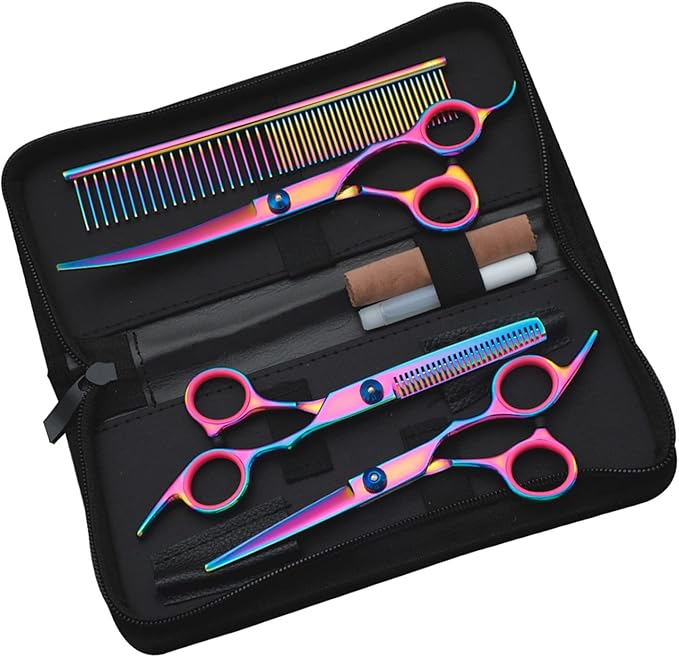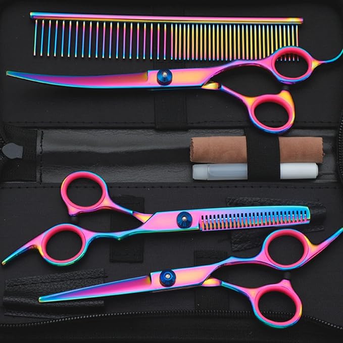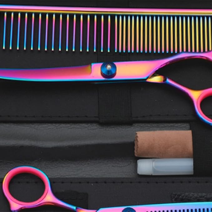 - What You Get: Professional pet grooming scissors set include 1 × thinning scissor, 1 × curved scissor, 1 × straight scissor, 1 × pet comb, 1 × cleaning cloth, 1 × black storage bag and 1 × Oil Bottle.