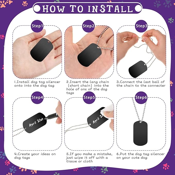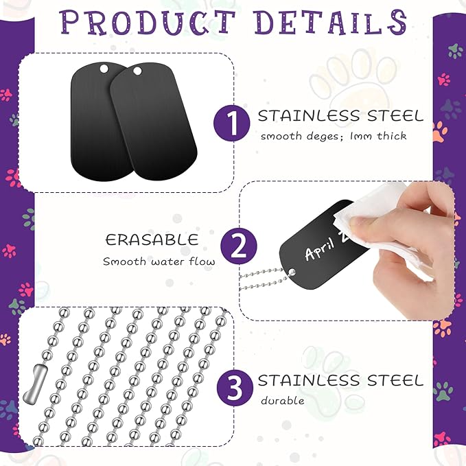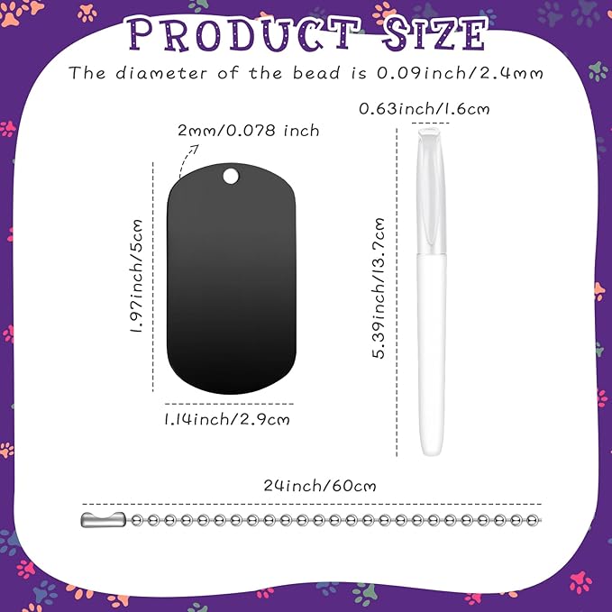 - Strong Material: dog tags for kids is made of aluminum material, with strong structure and smooth surface, reliable to use; Stainless steel chain is not easy to rust or break, can be stored for a long time; The equipped marker pen allows you to write something on the dog tag, and the writing is erasable