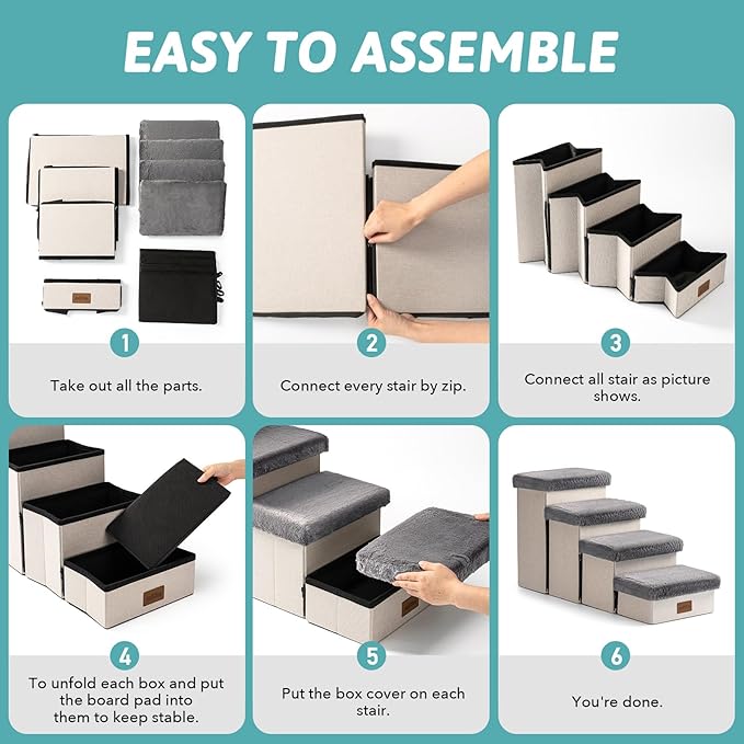 - 【Easy to Assemble】First you need to connect the zipper of each step, then open each step completely, Place each support board in the corresponding storage box, and finally cover it. When you don't need it, remove the cover and store it after it is completely folded. This saves your space and is suitable for small rooms. You can also watch our installation video in the product description below.