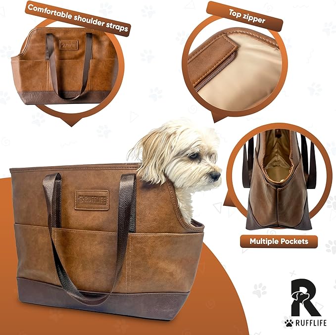 Luxury Dog Purse Carrier for Small Dogs, Faux Leather Pet Carrier Purse, Secure Harness Clip, Dog Tote Bag Carrier for Small Dogs and Puppies - Brown
