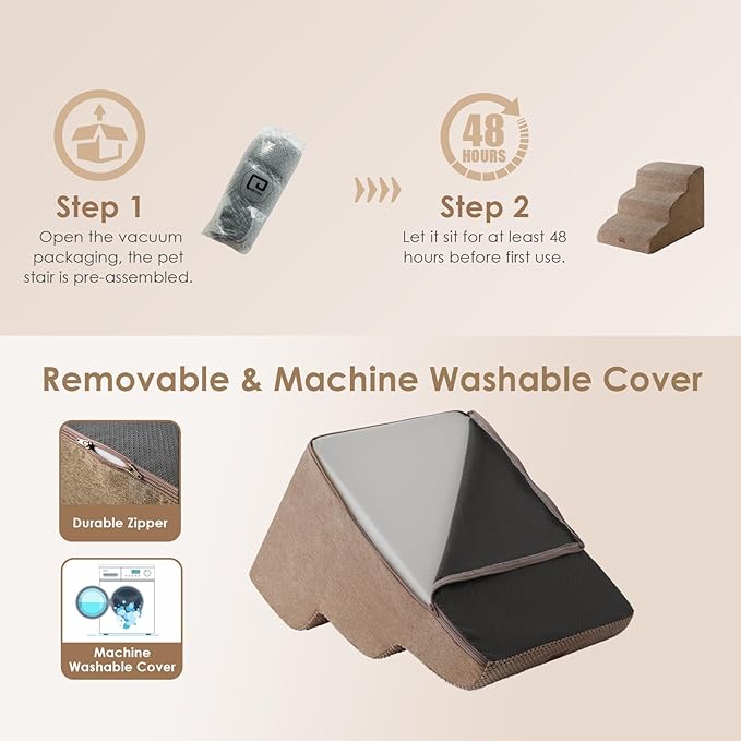 - SPECIFIC AND STEADY DESIGN - 33D density of pure foam make this stair more steady when your pets walk on. The dog bed stairs can provide strong support for pets in the walking process. Low angle slope design can better protect your pet's joints.