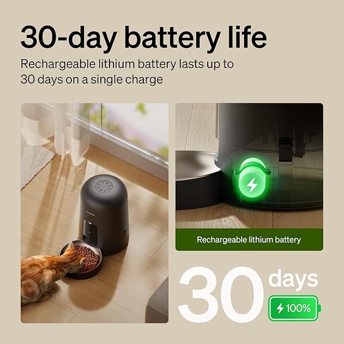 - Rechargeable Battery-Operated Feeder - The Wi-Fi automatic cat food dispenser is powered by a built-in rechargeable lithium battery. It takes 8 hours to be fully charged and has a battery life of up to 30 days. It not only saves the cost of battery replacement, but is also more environmentally friendly and flexible; No more limitations of power sockets, giving you more flexibility in choosing its placement.